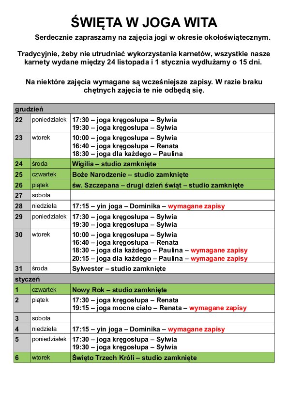 Serdecznie zapraszamy na zajęcia jogi w okresie okołoświątecznym.